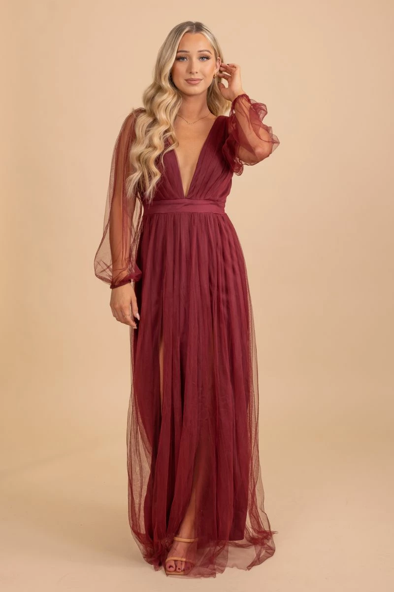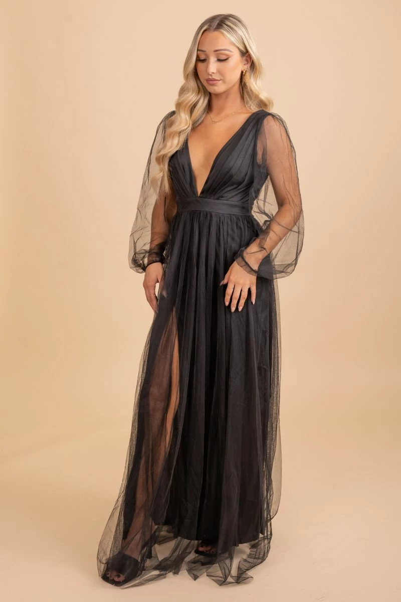 Our new Give Me The Spotlight Maxi Dress will quickly become your new favorite piece! This stunning gown features a deep v-neckline, two trendy color options, and gorgeous mesh details! The maxi length and thigh-high slit make this dress so elegant!