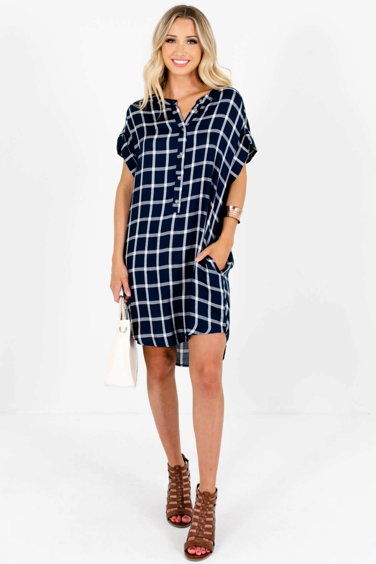 This is a clearance item and is a final sale – no returns or exchanges.Our new Back to School Navy Plaid Mini Dress is so cute! This adorable dress has a navy blue and white plaid pattern. It features a button-up bodice, faux cuffed sleeves, and a subtle high-low hem. Plus, it has pockets! The cotton material is comfortable and classic. Pair the Back to School Navy Plaid Mini Dress with your favorite boots for a darling outfit!