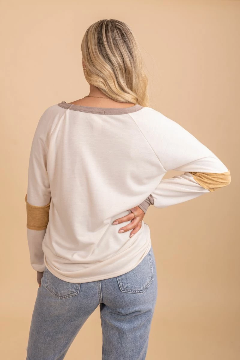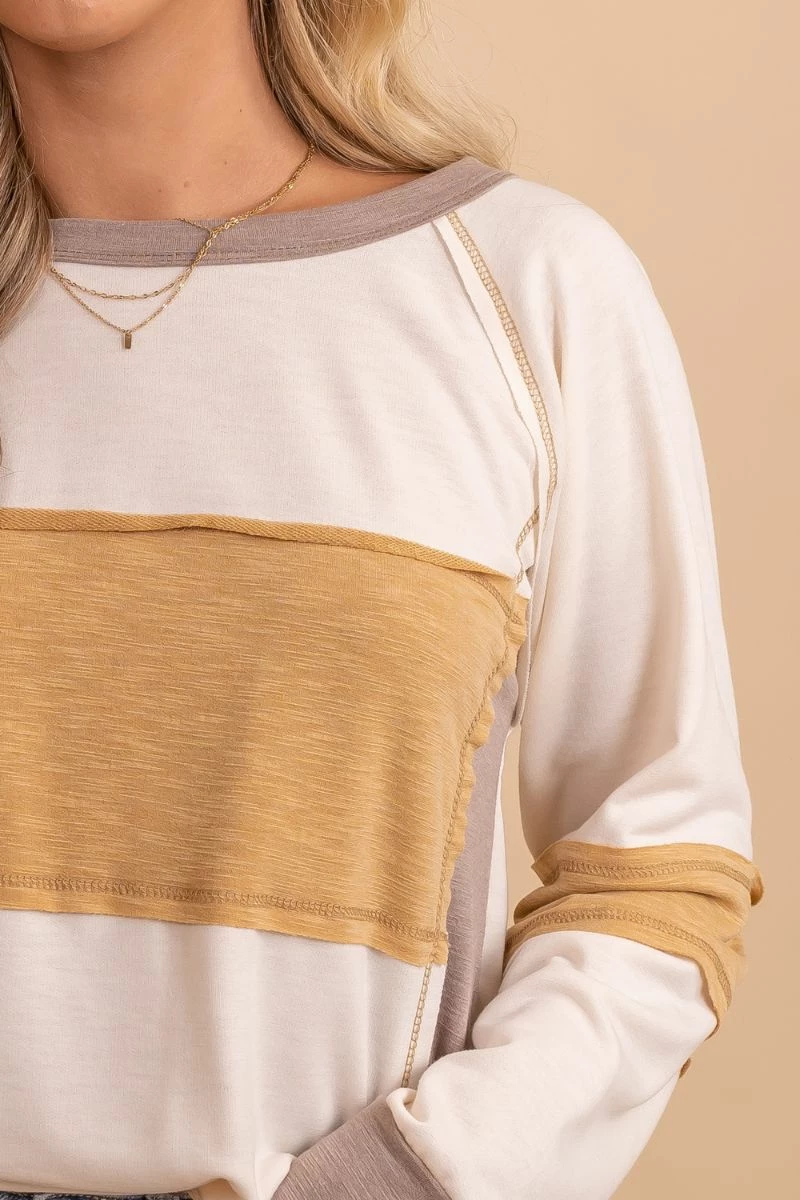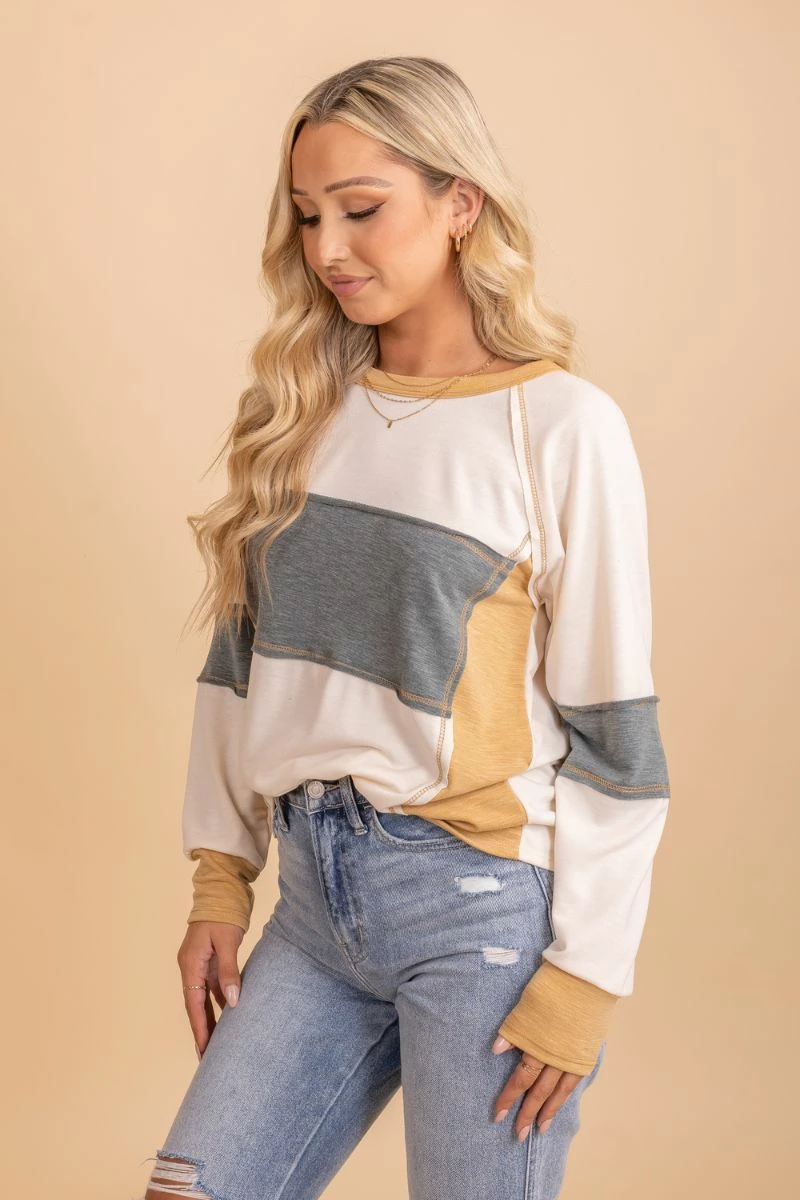 Pair our Be A Light Color Block Long Sleeve Top with skinny jeans and your favorite booties to create a cute everyday outfit!