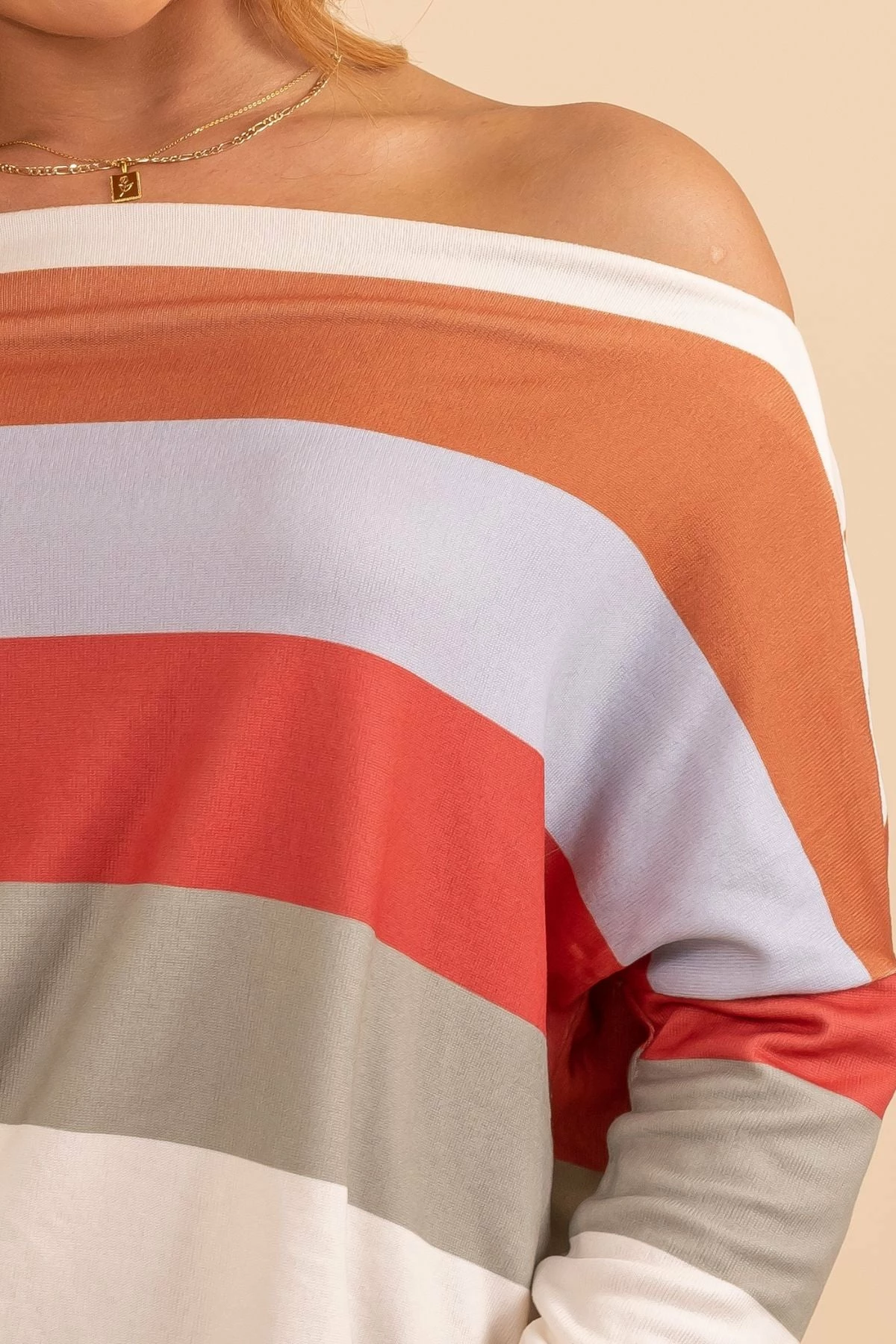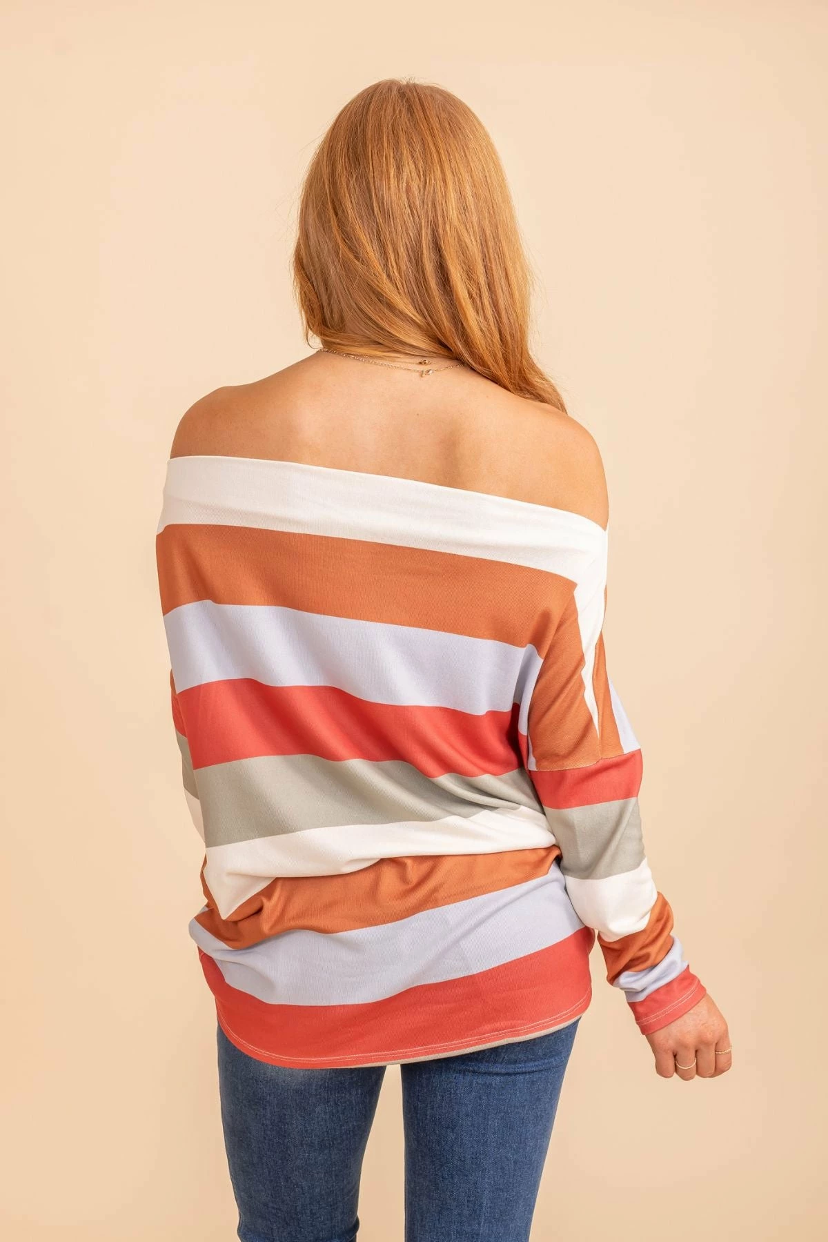 Our new Living Loud Striped Wide Neck Top is the cutest statement piece! This cute top features different fall colored stripes, long sleeves, and a comfy relaxed fit. The wide neckline allows you to wear this top on one shoulder or off both shoulders making it so fun to wear!