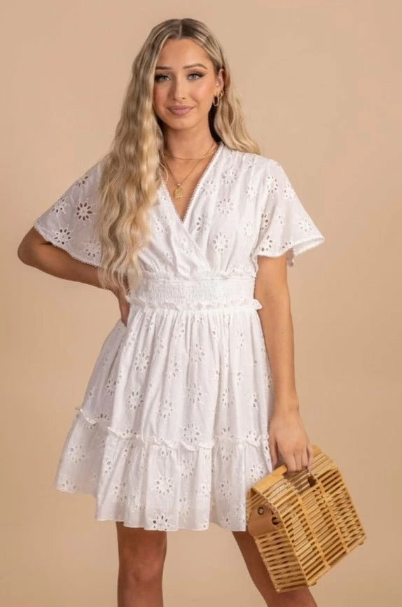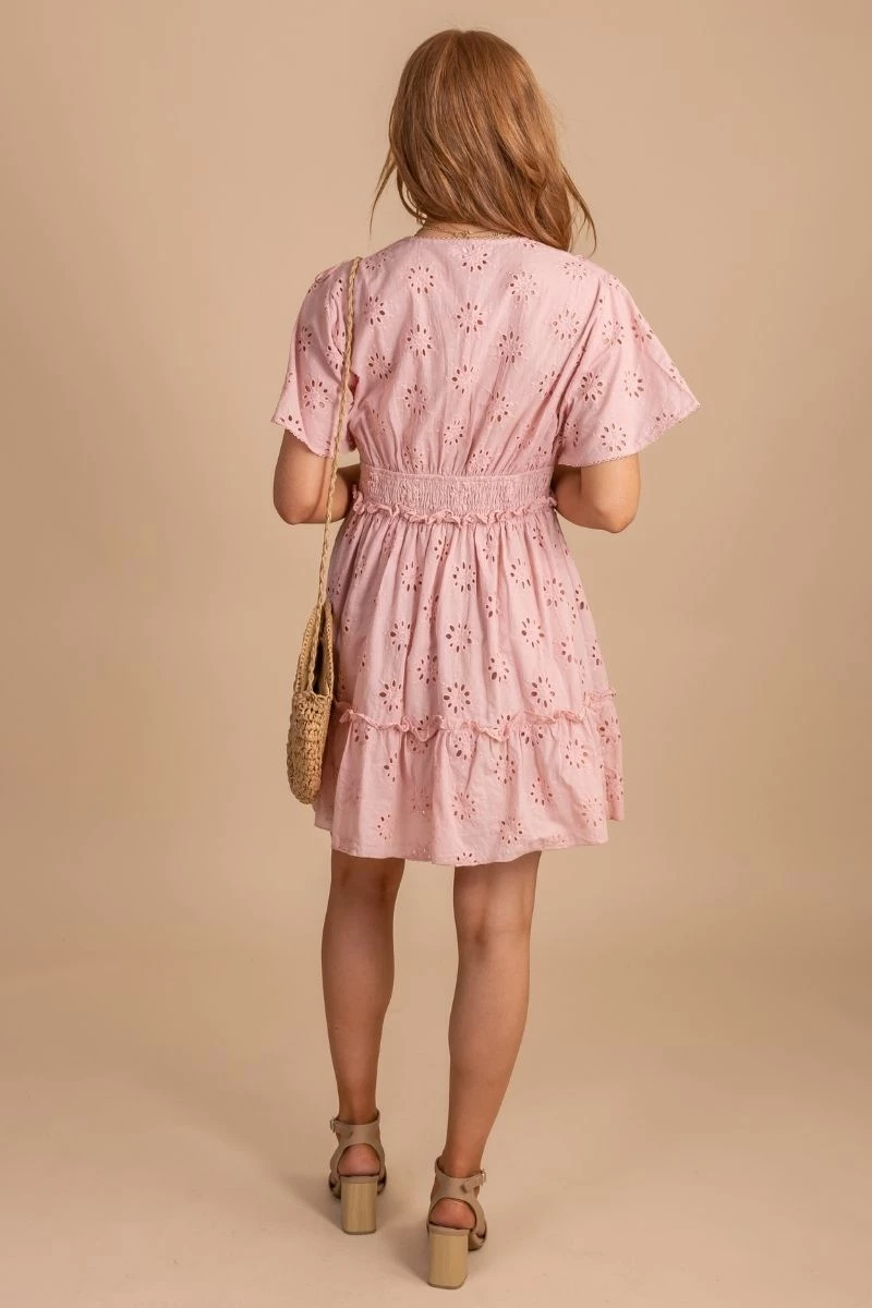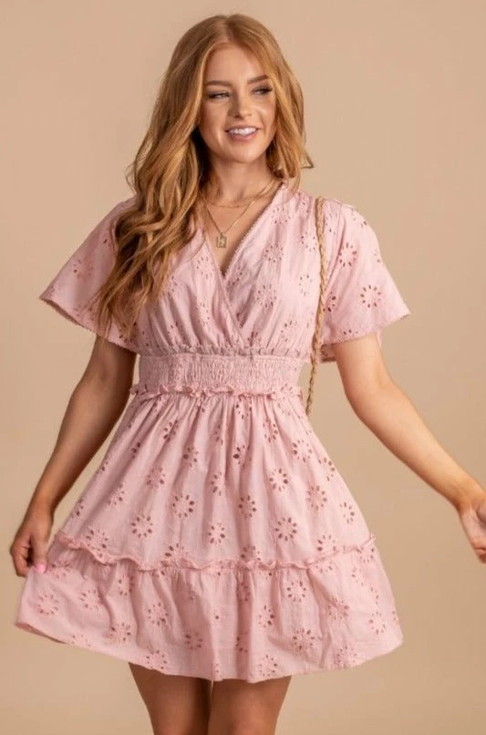 Our new Bring On Spring Eyelet Mini Dress is absolutely gorgeous! This mini-length dress comes in a solid pink or white color. It features flutter sleeves, v-neckline, and eyelet detail! We’re in love with the high-quality material that’s complete with an interior lining. The eyelet detailing, smocked bodice, and flutter sleeves take this dress to the next level! Pair our Bring On Spring Eyelet Mini Dress with platform sandals to create a beautiful spring outfit.