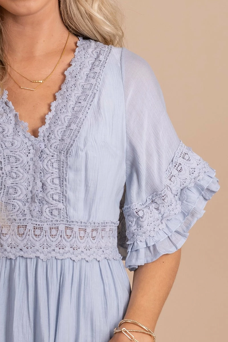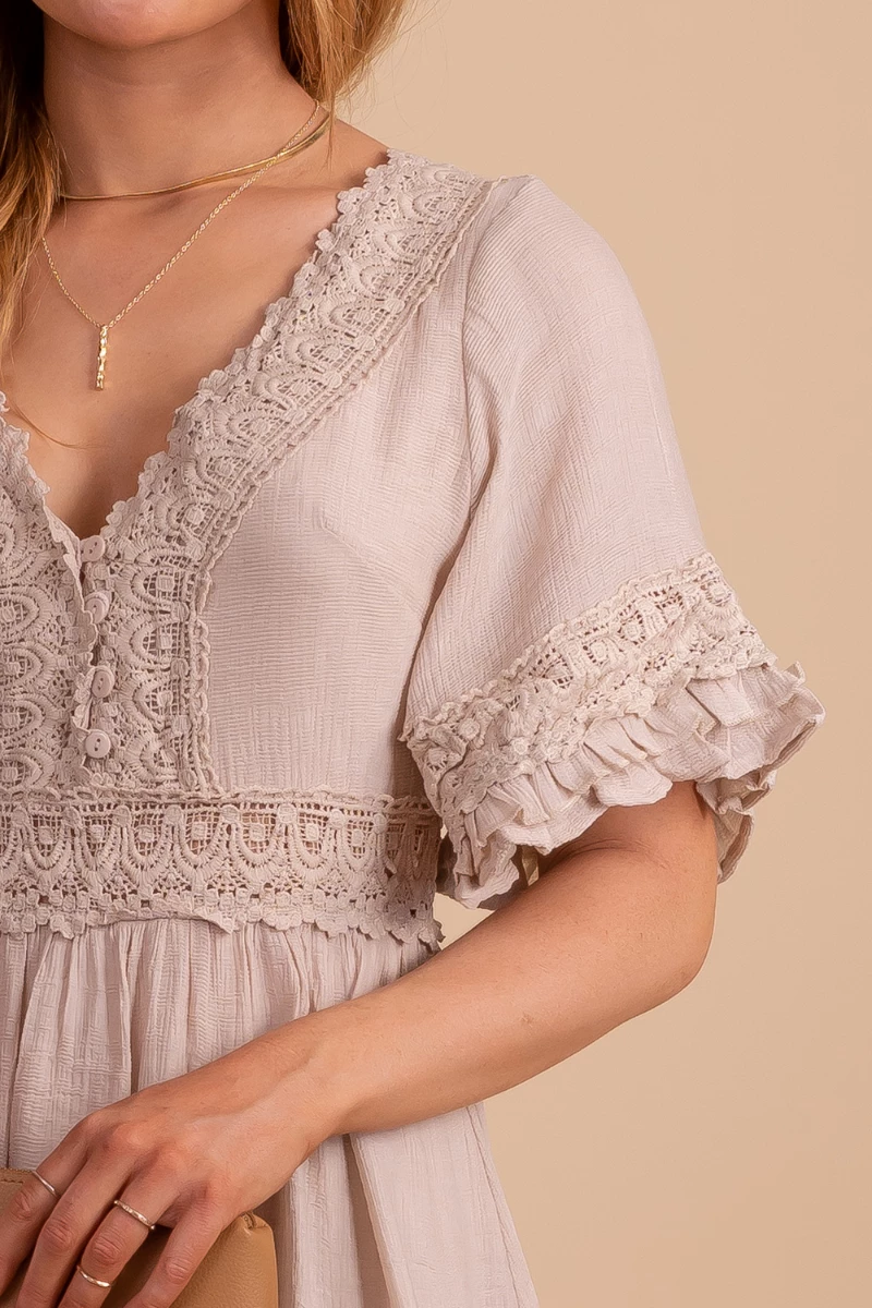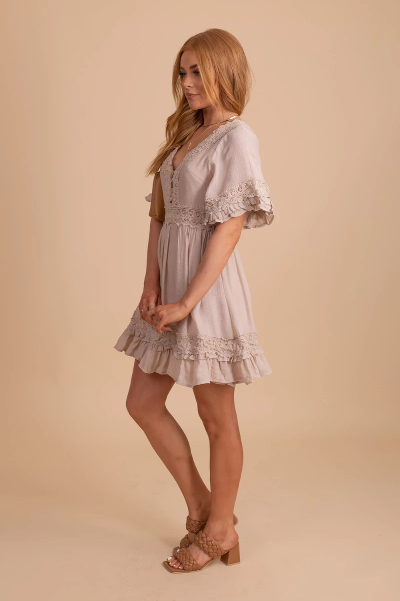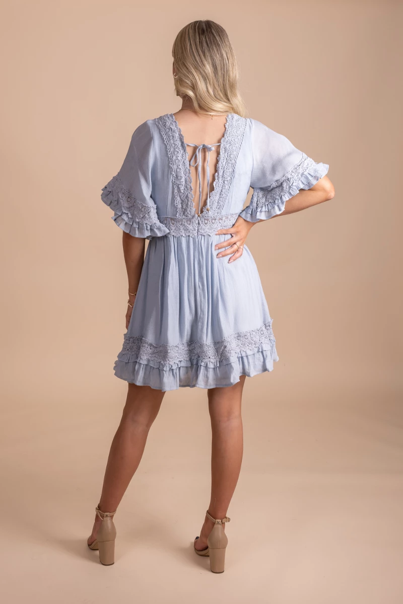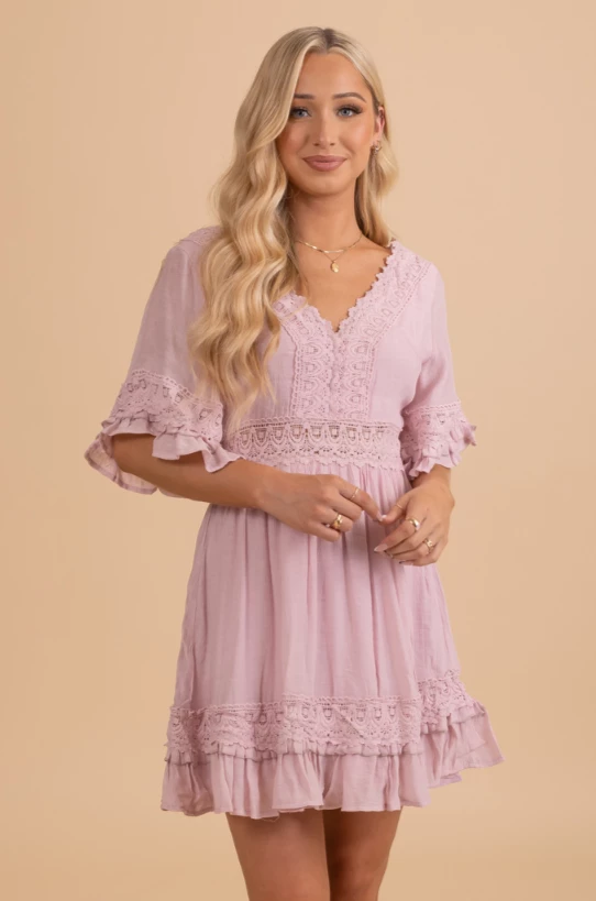 Our new This Time Around Lace Detail Mini Dress is one of our favorites! The material is light and flowy, making it so easy to wear. The v-neckline, lace detailing, and self-tie back creates such a stunning silhouette that you won’t want to take off!