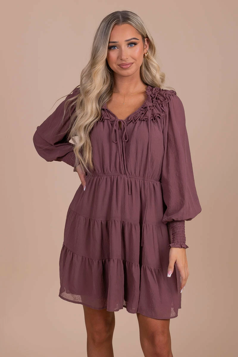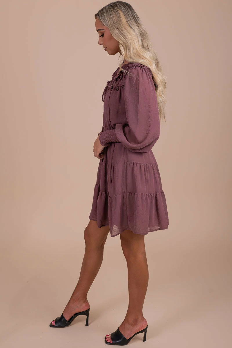 You’ll fall in love with our new Caught Up In The Details Long Sleeve Mini Dress! This mini dress features long puff sleeves, a self-tie v-neckline, and a tiered skirt! The purple color is so cute, and so easy to pair with anything! The flowy silhouette is so flattering and cute! Pair your Caught Up In The Details Long Sleeve Mini Dress with your favorite platform booties to wear this all fall long!