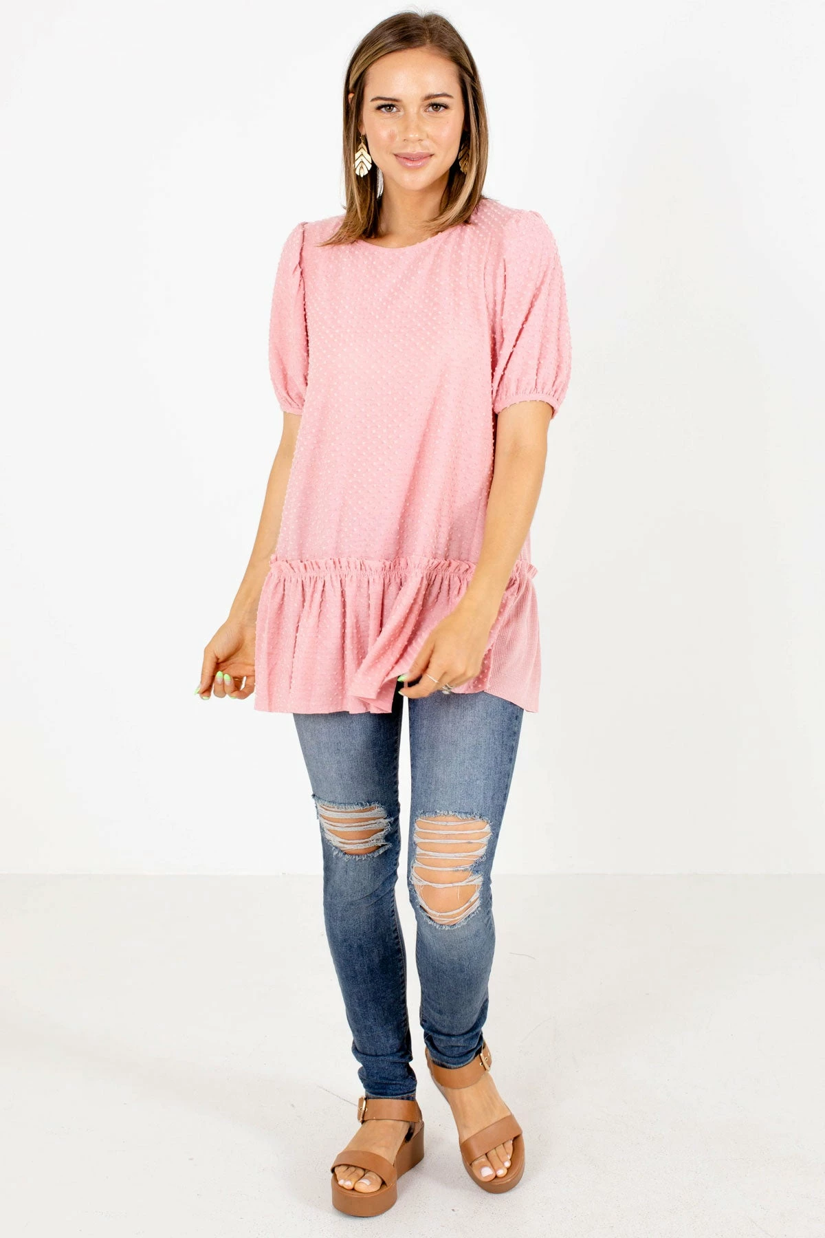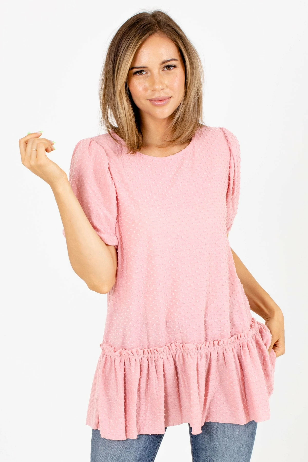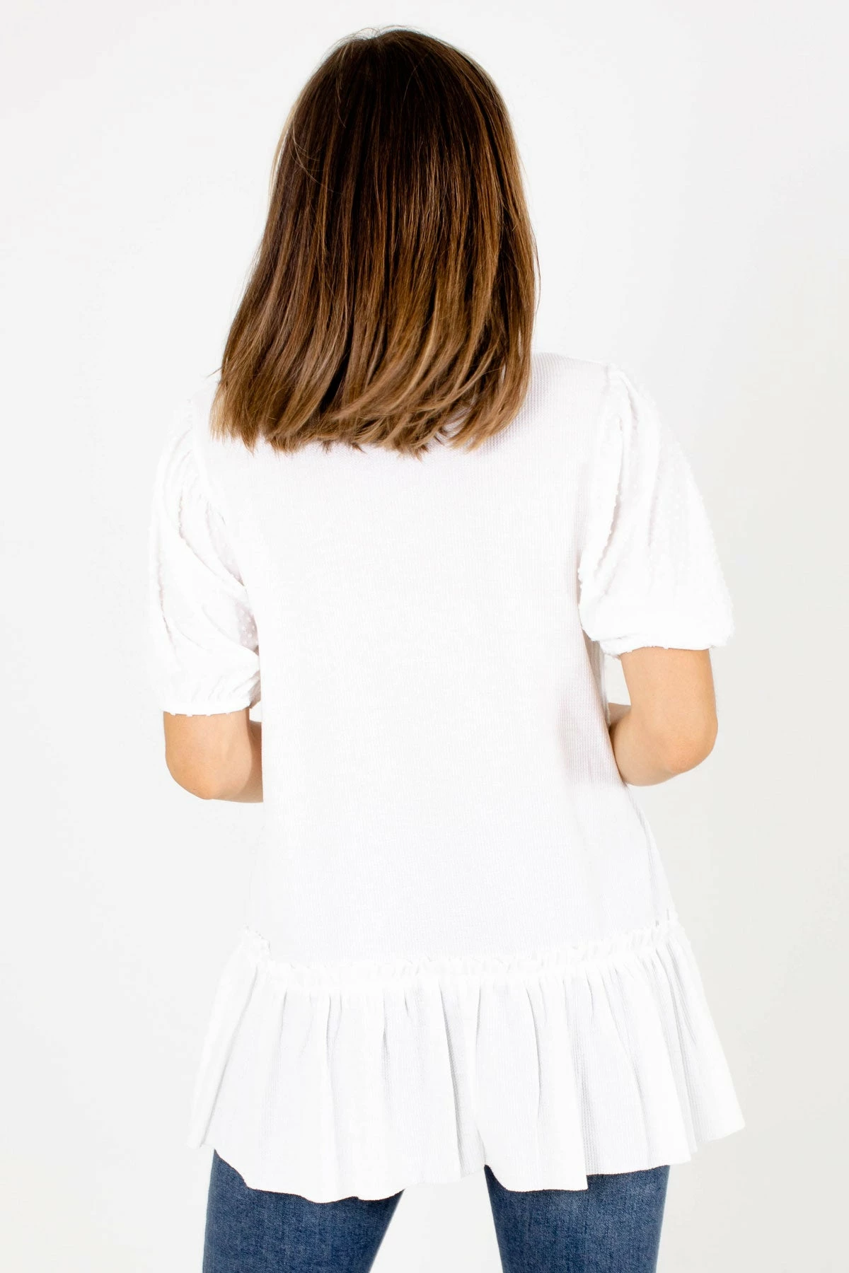 Our new Think it Over Textured Blouse is perfect for everyday wear! This cute top is composed of high-quality, swiss dot material. We’re in love with the round neckline, ruffled accents, and trendy peplum style hem! The contrasting fabric on the back adds the perfect finishing touch. Pair our Think it Over Textured Blouse with your favorite skinny jeans and platform sandals!