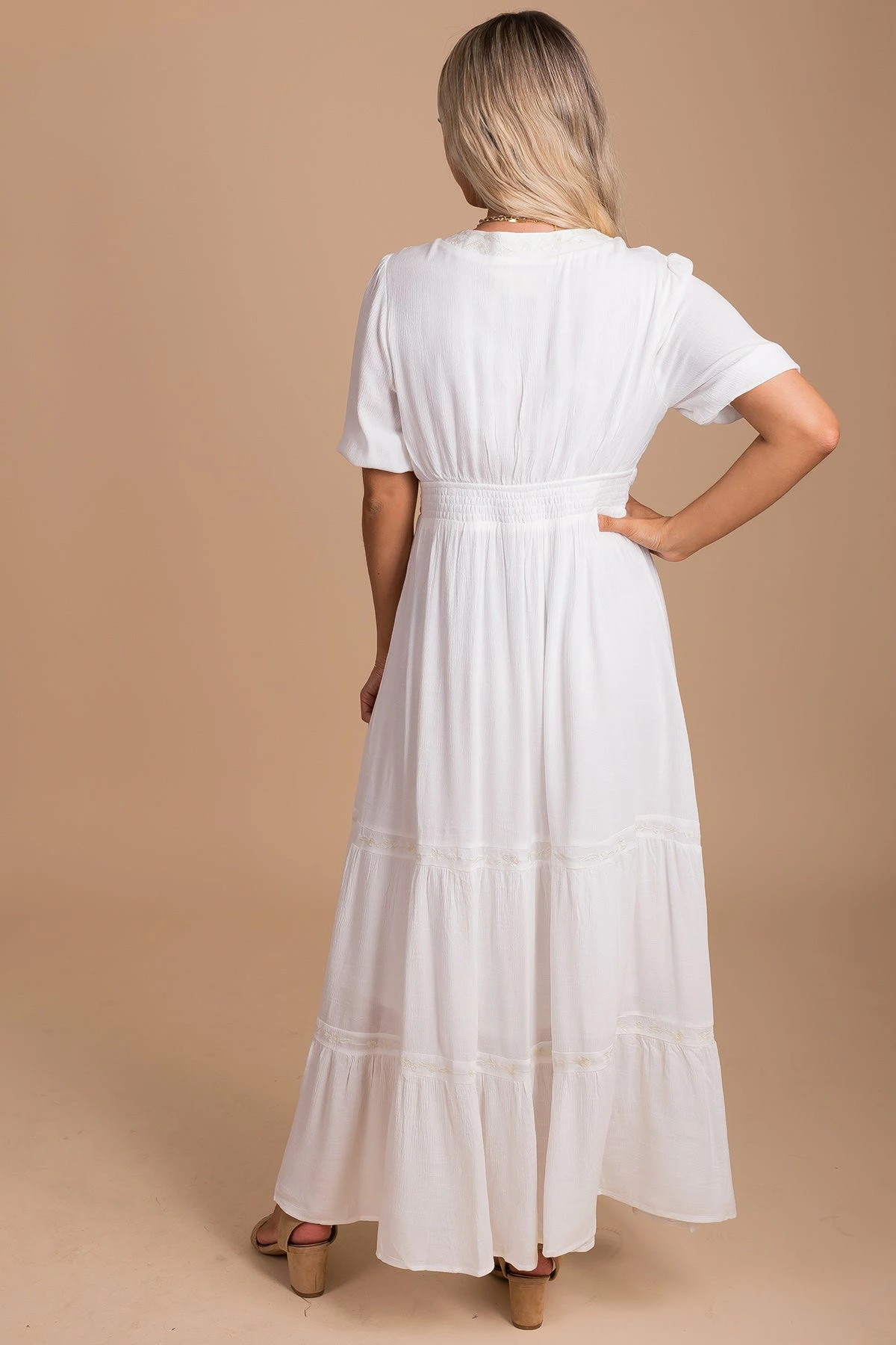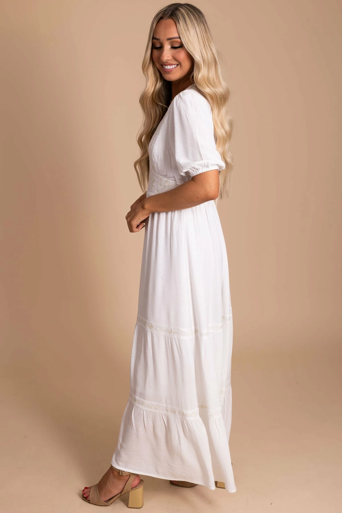 Keep blooming with the Be A Wildflower Maxi Dress! It features a v-neckline, short puff sleeves, and interior lining. Our favorite part of the dress is the gorgeous embroidered flower details on the bodice and tiers of the skirt. Wear our Be A Wildflower Maxi Dress with some strappy brown sandals to recreate our model’s cute look.