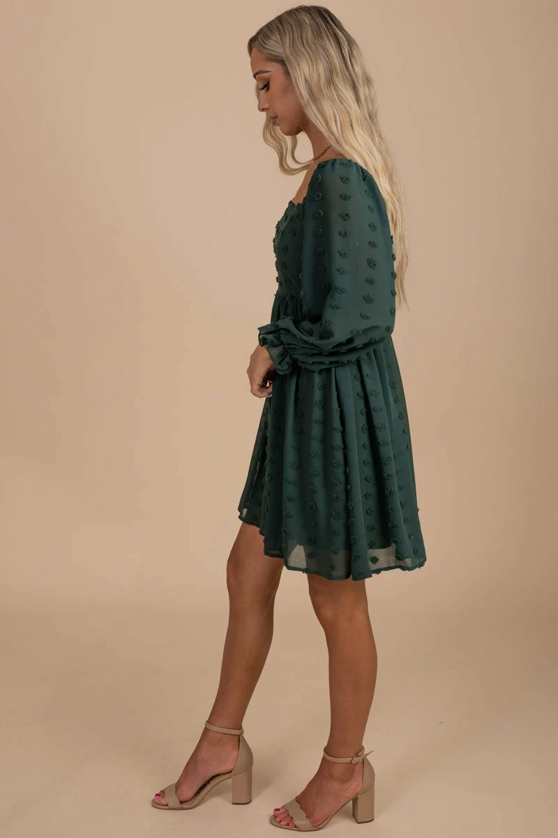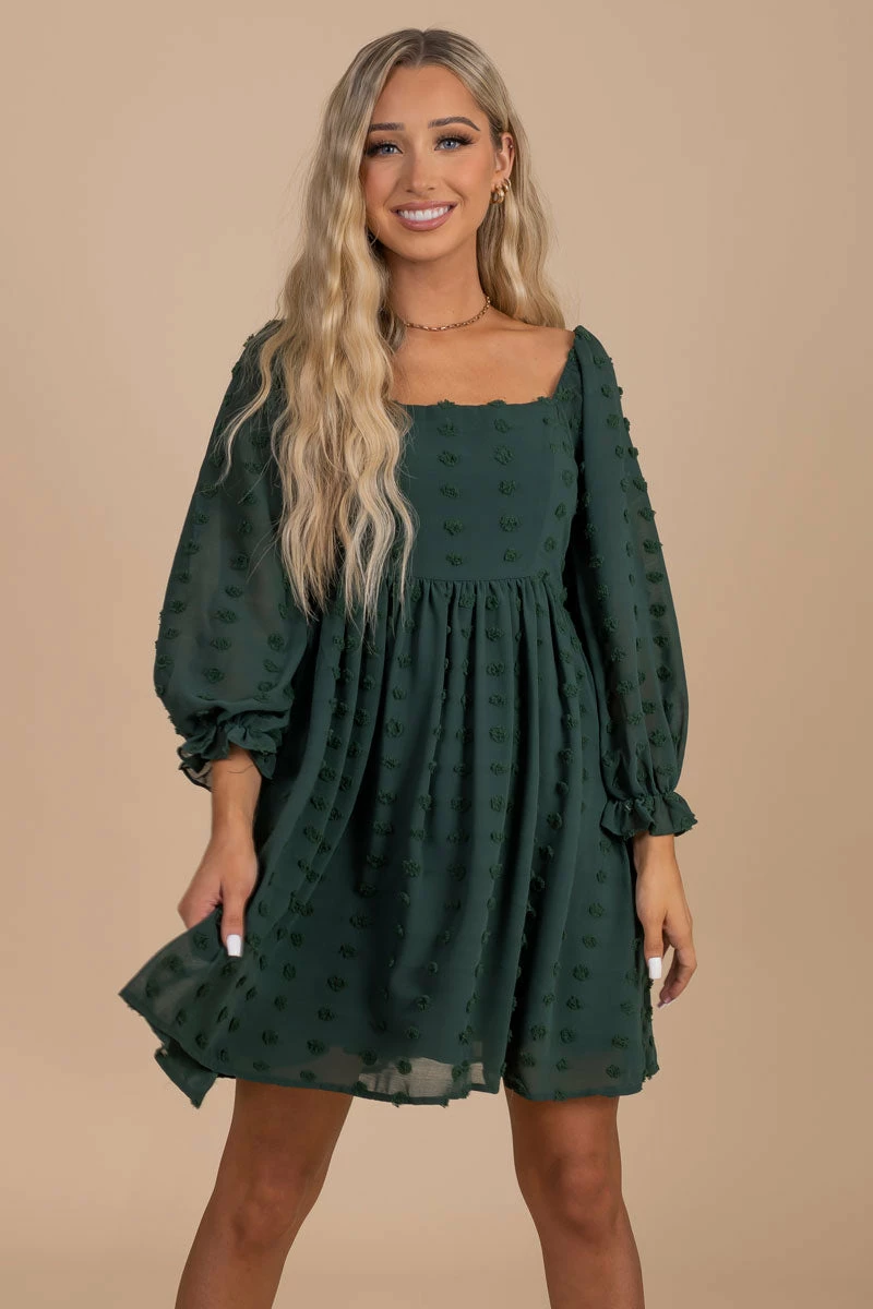 Our new Take Me Away Puff Sleeve Mini Dress is a closet staple! This stunning dress features a mini length with full lining, long puff sleeves, and a square neckline! The dark hunter green color and textured dot details offer such a timeless touch to this unique dress!
