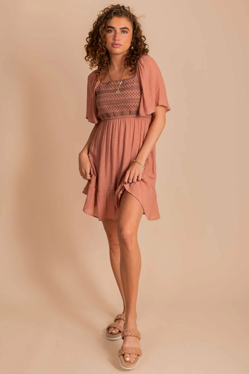The Sunset Dream Mini Dress is so cute! This dress features a mid-thigh length and a flowy silhouette, making this dress perfect for a hot summer day! The flowy sleeves and gorgeous stitched embroidery details on the bodice make this dress so fun to wear! Pair your Sunset Dream Mini Dress with your favorite pair of sneakers for a casual and cute summer outfit!