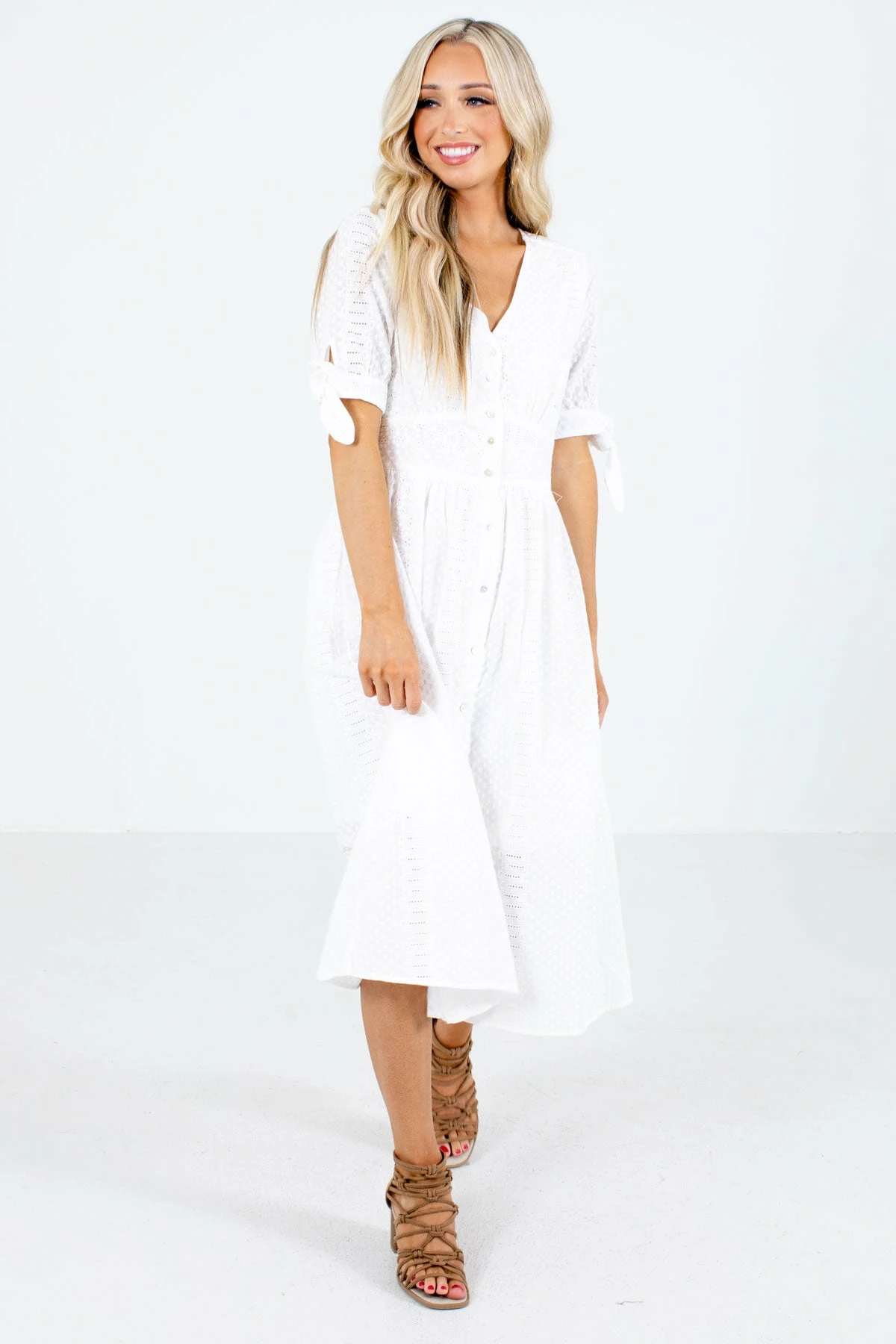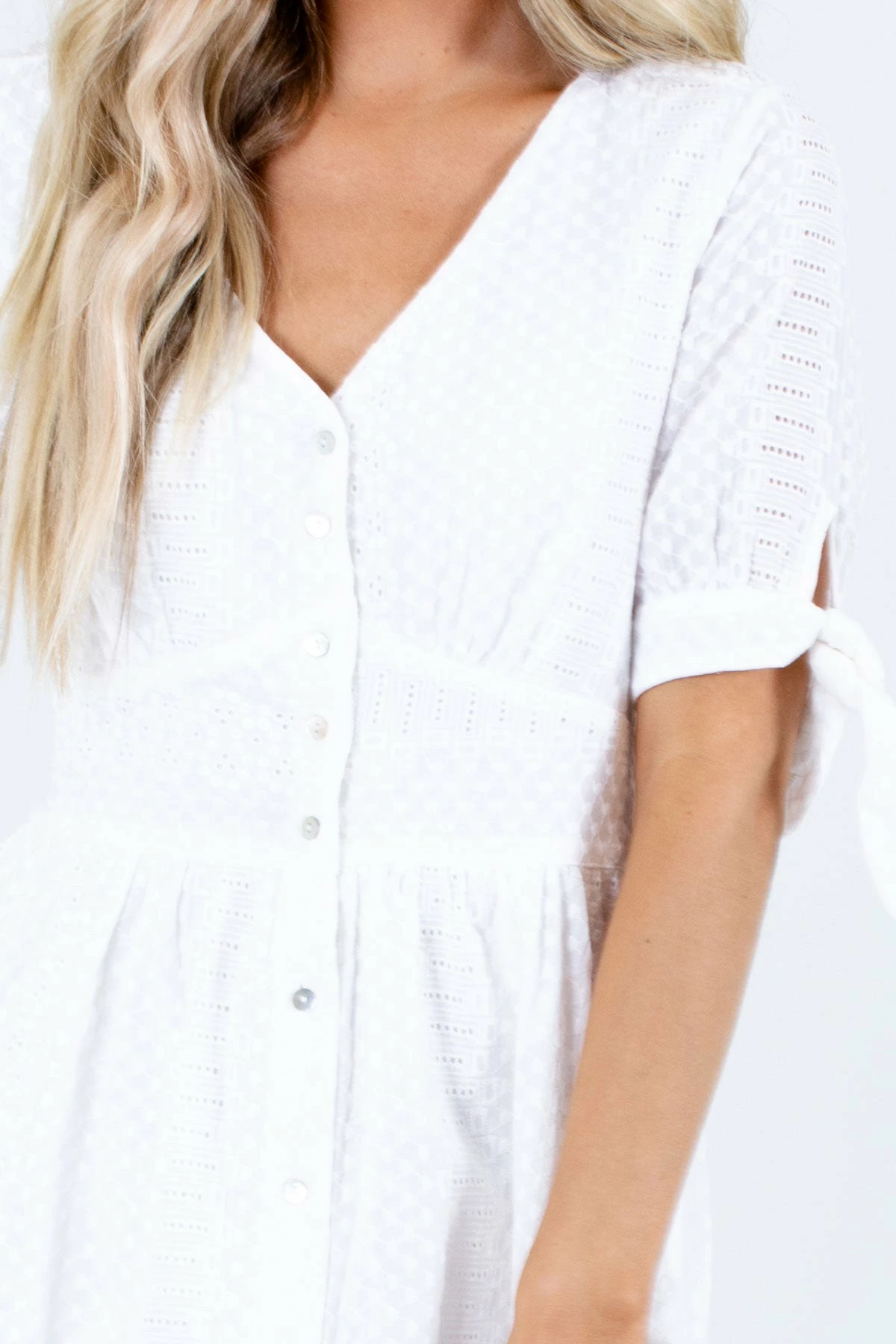 You’ll fall in love with our new Kiss Somebody White Midi Dress! This midi length dress is a solid white color. It features a button-up front, v-neckline, and adorable self-tie sleeve accents! The textured eyelet material is right on trend for the upcoming season. The skirt lining adds the perfect finishing touch! Pair our Kiss Somebody White Midi Dress with heeled sandals to recreate our model’s gorgeous outfit!