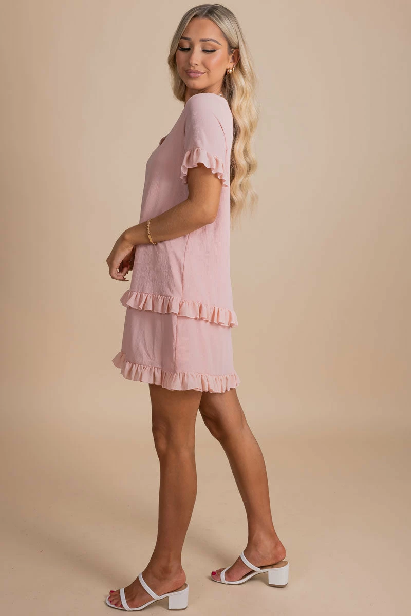 You’ll fall in love with our new Extraordinary Life Ruffle Mini Dress! This mini dress features high-quality, textured material that creates a comfortable and flattering silhouette. We’re obsessed with the v-neckline and ruffled accents! The full lining adds the perfect finishing touch. Pair our Extraordinary Life Ruffle Mini Dress with platform sandals to create a cute outfit that can be worn anywhere!