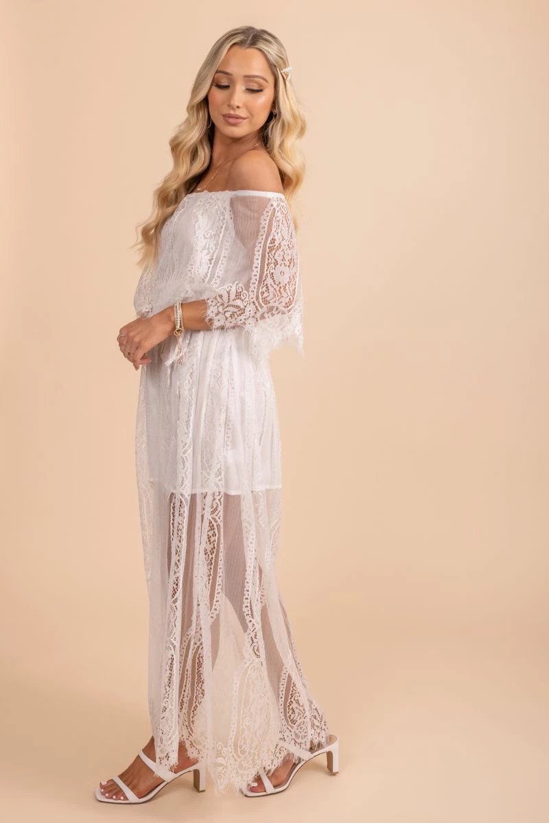 Spark some love in our Be Mine For Life Lace Maxi Dress! This gorgeous dress is white and it has stunning details. It features the cutest off the shoulder style, and a partial lining on the bust and skirt. Our favorite part of this dress is the efflorescent lace overlay which extends past the hem and sleeves, creating an ethereal, romantic look.