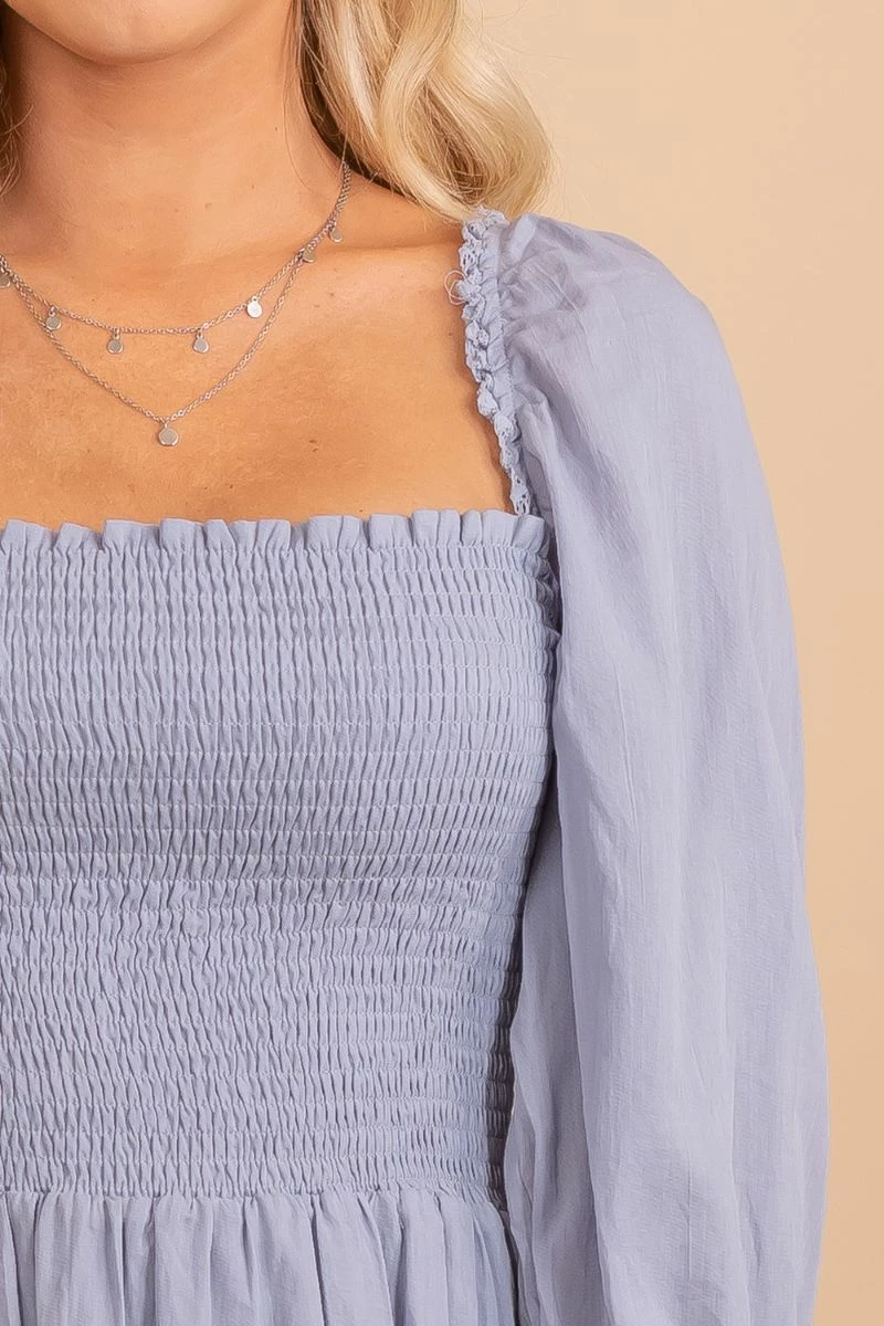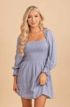 Our new Go With The Waves Square Neck Mini Dress is a spring staple! It features the cutest blue color. We’re in love with the trendy off-shoulder option, cinched wrist sleeves, and smocked style!