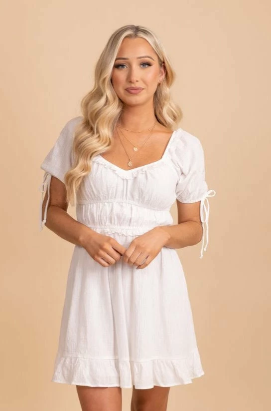 Our new The Good Is Coming Mini Dress will quickly become your new go-to! We’re in love with the perfect mini-length, ruffle trim, and cinched details! This dress comes in the cutest light brown and white color.