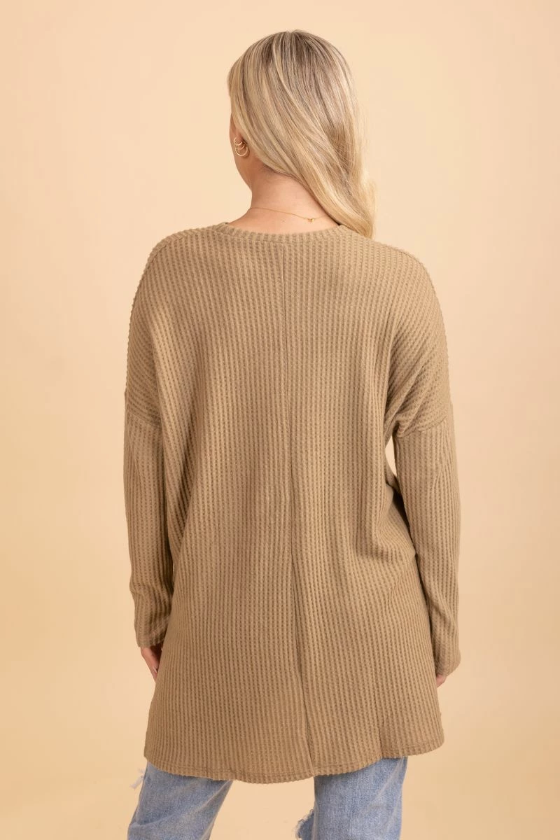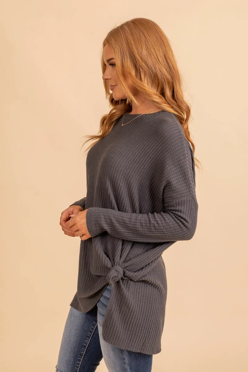 Our new Beautiful Thinking Waffle Knit Top will be the perfect addition to your wardrobe! It features soft, waffle-knit material in dark gray and black. We’re in love with the long sleeves, flattering fit, and round neckline! The comfortable, oversized fit is great for layering.