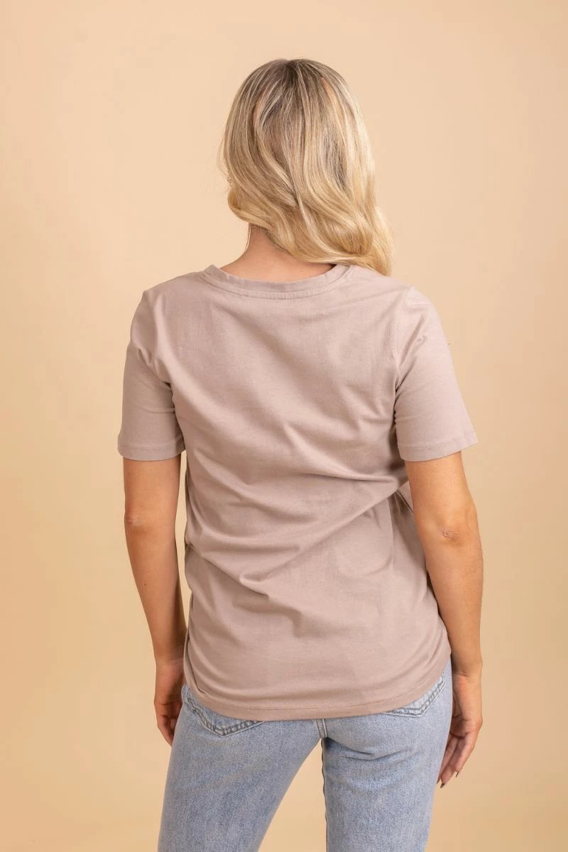The light brown color is perfect for this upcoming season! You could also add some personality to this look by wearing some cute patterned pants and ankle boots or sneakers!
